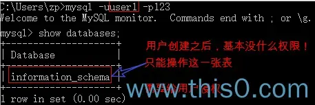 /* 1.创建用户 CREATE USER '用户名'@'主机名' IDENTIFIED BY '密码'; 2.关键字介绍 a.用户名:创建的用户名 b.主机名:指定该用户在哪个主机上可以登录,如果是本地用户,可以用'localhost', 如果想让该用户可以任意远程主机登录,可以使用通配符% c.密码:该用户登录的密码,密码可以为空,如果为空,该用户可以不输入密码就可以登录mysql */ -- user1用户只能在localhost这个IP登录mysql服务器 CREATE USER 'user1'@'localhost' IDENTIFIED BY '123'; -- user2用户可以在任何电脑上登录mysql服务器 CREATE USER 'user2'@'%' IDENTIFIED BY '123';