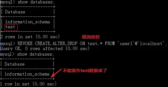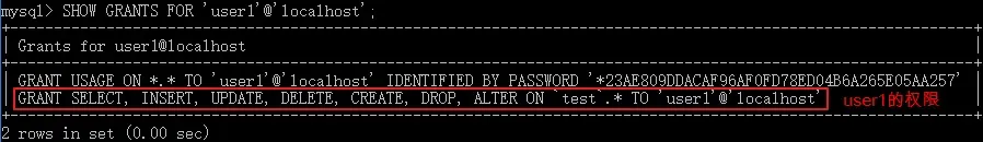 /* 分配用户的权限: GRANT 权限1, 权限2... ON 数据库名.表名 TO '用户名'@'主机名'; 关键字介绍: a.GRANT:授权关键字 b.授予用户的权限,比如 'select' 'insert' 'update'等,如果要授予所有的权限,使用 'ALL' c.数据库名.表名:该用户操作哪个数据库的哪些表, 如果要授予该用户对所有数据库和表的相关操作权限,就可以用*表示: *.* d.'用户名'@'主机名':给哪个用户分配权限 */ GRANT CREATE,ALTER,DROP,UPDATE,DELETE,SELECT ON 220212_java2.* TO 'user1'@'localhost';
