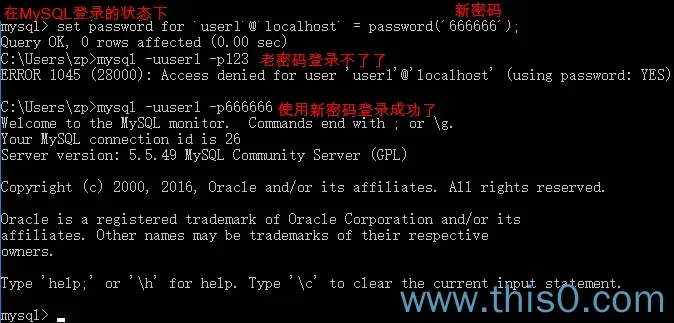 set password for'user1'@'localhost'= password('666666');